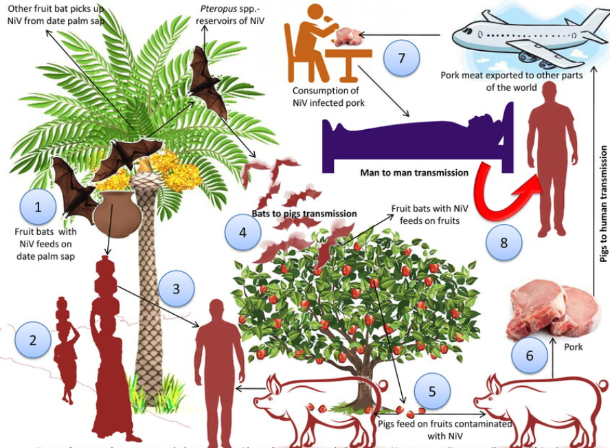 니파바이러스의 감염 경로는 비교적 명확하게 정리되어 있다. 첫 번째 감염 경로는 과일박쥐의 침이나 배설물에 오염된 과일, 또는 대추야자 수액을 섭취하는 경우이다. 일부 지역에서는 생과일이나 생즙을 위생 처리 없이 섭취하는 문화가 남아 있어 감염 위험을 높인다.