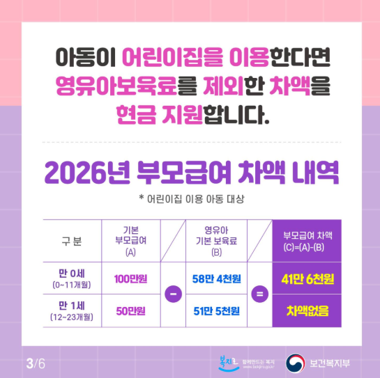정부 카드뉴스에서는 2026년 보육료 기준을 반영한 예시로, 0세는 (100만원 - 58만4천원 = 41만6천원), 1세는 (50만원 - 51만5천원 = 차액 없음)을 안내합니다. 이는 “어린이집 이용 시 보육료 지원 후 남는 금액만 현금으로 지급”된다는 구조를 직관적으로 보여줍니다.